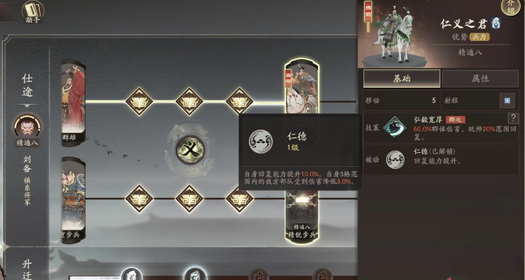 游戏中刘备的强度其实并不高,输出数据来体现,而是利用了一些团队增益以及本身的续航带来一些更高的上限效果,刘备他的技能效果上面,其实被动仁德属于是必有的,这个效果也是可以给全队带来足够的辅助效果,在我方的武将生命数值上限上面,根据他的仁德技能,就可以带来18%的提升效果,而且在其他的队友释放了技能之后,刘备还有其他的概率可以为这个队友恢复10%的生命数值能力,当然这样的回复效果虽然好用,但是在每个回合里面,最多可以触发的上限次数只有3次。