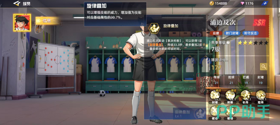 最后这个技能叫做旋律叠加,是在浦边反次使用了【果决抢断】这个招式的时候可以获得一些加成,基础的加成就是给球员自身添加1层旋律叠加的效果,这里这个效果会持续33秒,旋律置加的效果就是可以增强浦边反次技能上面的的威力,且增加值是根据技能来对应的,根据对应基础属性的30.7%来进行叠加,每一层叠加之后带来的百分比都是固定的,这个效果最多是可以叠加2层的,所以最多的情况下也有60%左右的提升空间,后期持续的时间也不短。