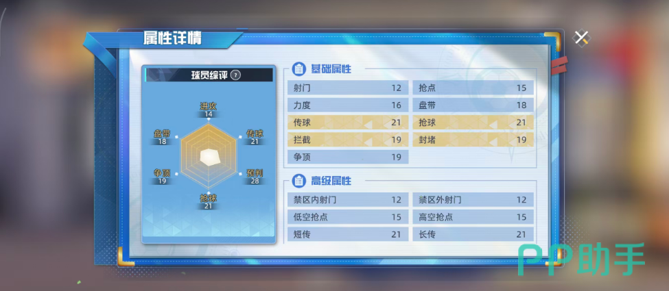 这里他的传球数值达到21分,而抢球跟传球的评分一致,拦截效果上面虽然只有19分但是比其他品质角色的效果还是要好一些,其次就是封堵的效果也达到了19分,这个属性还是比较有用的,六维图当中其实最差的就是进攻的效果,而在预判能力上面有28,所以搭配了封堵的能力之后,这个角色不管是用来长传还是短传都是不错的。抢断技能上面大家要用浦边反次来进行的话,这里可用的技能就是果决抢断,这个技能在上面可以进行一次威力为65.6%的抢断动作,只要这一次的抢断动作成功的话,后期浦边反次在盘带属性上面就会有32.8%的空间可以提升,不过这个提升效果是只有10秒的生效时间的。