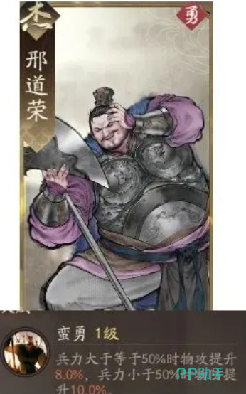 那么最后就是一个邢道荣副将的推荐,邢道荣在品质上面虽然没有上面的三个超品的副将品质高,但是他在前期很好获取,而且也是属于属性上面比较优质的一个副将,他的天赋效果叫做蛮勇,在比例大于或者是等于50%的时候可以带来物攻上面的提升效果,每一次带来的也是8%的数值提升,而且在整体的兵力小于50%的时候,邢道荣的物防提升效果也会有10%的上限可以进行提升,所以相对来说也是可以放在过渡期给吕玲绮搭配的一个副将。