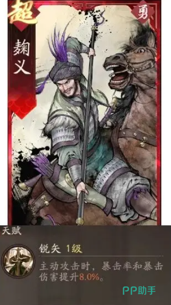 那么如果没有以上两个副将的时候,大家可以选择的是麹义这个副将,麹义目前的话也是放在一些暴击以及爆伤上面比较通用的搭配,他用做吕玲绮的副将的话,本身暴击不高的这点确实是有效果的,但是这两者之间的相性一般,所以大家需要用麹义的情况下,是没有上面两个副将的时候可以用他来进行代替,他的天赋效果叫做锐矢,这个天赋效果在出动攻击的时候,可以产生暴击率以及暴击伤害提升8%的数值效果,这样的一个效果也可以为麹义带来足够的增伤能力。