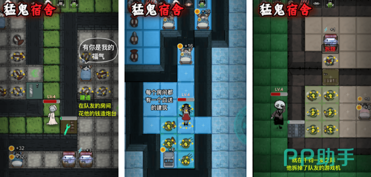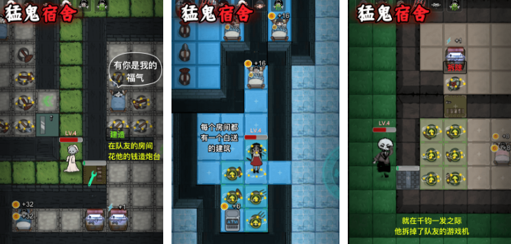 猛鬼宿舍是像素风格的塔防生存手游,核心玩法围绕躺平者与猛鬼的攻防对抗展开,每局对战包含多名躺平者与一名猛鬼,开局后躺平者需迅速选择房间入住,依靠床铺持续产出的资源建造大门与防御炮塔,胜利条件分为两种,躺平者坚持到倒计时结束或成功击败猛鬼即可获胜,若所有房间均被攻破则猛鬼胜利。