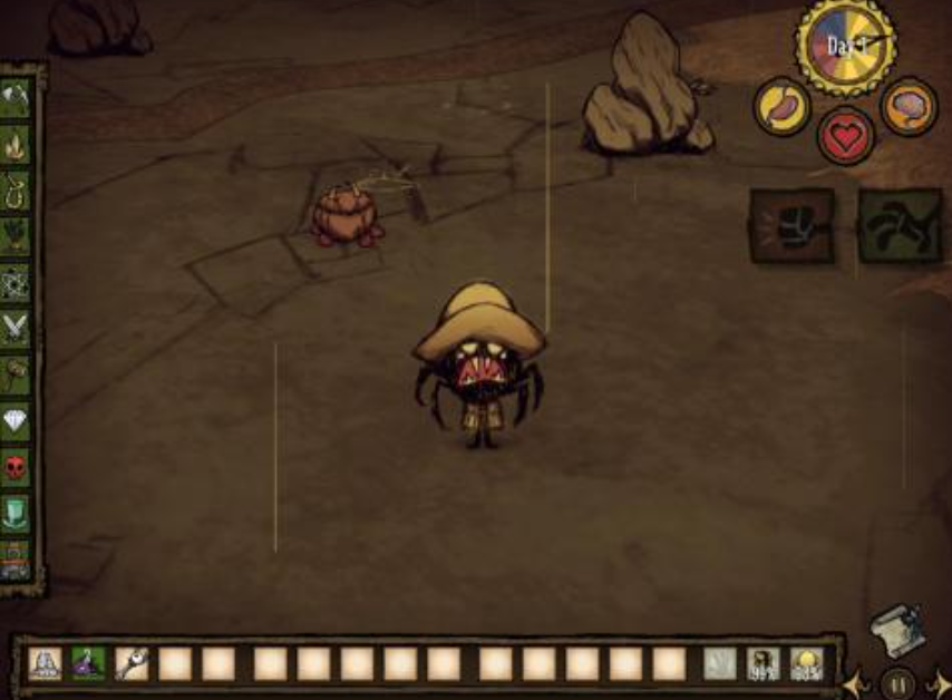 这是一款画风偏卡通类的生存类游戏,“生存”就是整个游戏的主线。玩家需要时刻注意自己的饥饿值、生命值还有精神值,饥饿值可以通过收集浆果、打猎去维持,精神值过低玩家就很有可能受到可怕的怪物袭击,所以就需要通过摘花、和友好生物相处来恢复自己的精神值。在每一局游戏中,玩家们都会被随机到不同的地图,有可能附近就会有类似洞穴、遗迹等特殊地区等待着玩家们去探索,除了地图随机之外,不同的环境也会随机不同的特殊事件,比如冬季就要小心河水结冰,夏季就要小心树木自燃......整个游戏的随机性非常强,游戏难度不低。