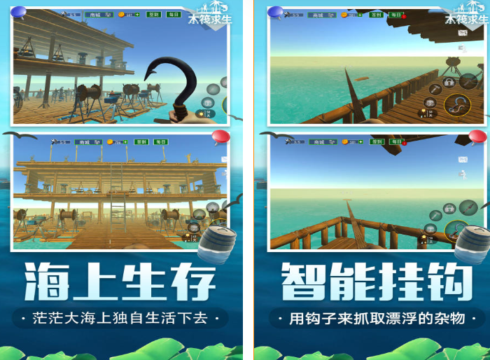 这是一款模拟海上漂流的独自求生游戏,玩家们开局的出生点就是在一个由几块破木板拼接而成的木筏上,飘荡在茫茫的大海中。这款游戏模拟真实的海上求生,在游戏的最开始玩家们可以通过钓竿来钓鱼以维持饱腹度,在吃饱了之后就可以通过钩子来抓取海面上漂浮的杂物来帮助求生,制作武器、加固木筏或是对木筏进行改造升级,在求生的过程中也会遇到类似于鲨鱼、章鱼等生物的攻击,这时候就需要玩家们勇敢战斗,保护自己的生存场所。