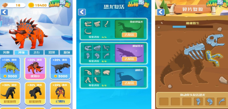 变异恐龙创新性地将跑酷与恐龙进化相结合,玩家操控恐龙在史前大陆的多样场景中奔跑,跑酷过程中需应对复杂的地形障碍,同时还要收集散落在赛道上的恐龙蛋与能量晶体,恐龙蛋可孵化出不同品种的基础恐龙,能量晶体则能为当前恐龙补充能量加速进化进度,每只恐龙都拥有独立的成长树,通过积累经验值可解锁冲刺、磁铁吸附等技能,这些技能的合理运用是突破高难度赛道的关键。
