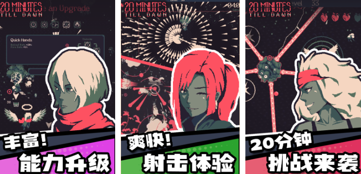 黎明前20分钟以俯视角弹幕射击为核心玩法,游戏设定在固定时长的关卡中,玩家需要在20分钟的时间结束前,抵御一波波不断递增的敌人攻击,随着时间的推移敌人的数量会越来越多,技能系统是游戏的核心玩法,初始技能通过角色升级逐步解锁,每个技能都拥有独特的攻击方式与效果,随着战斗的推进玩家可以通过拾取特定的道具。