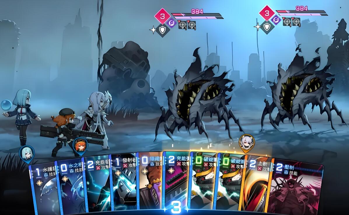 本作采用卡牌驱动的回合制战斗模式。每回合开始时,玩家将获得3点行动点数(AP),每张卡牌左上角标注了其消耗值。通过拖动卡牌至目标即可发动攻击,操作完成后点击右下角确认按钮进入敌方回合。战斗过程中存在“灵光一闪”机制,随机赋予某张卡牌额外增益效果,把握这一时机往往能实现战局逆转。值得注意的是,敌方行动顺序会受我方出牌逻辑影响,因此优先使用克制属性的卡牌攻击敌人弱点图标,将大幅提升输出效率并降低风险。