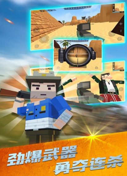 游戏采用类似我的世界形象设计,把队员形象和战场塑造成方块堆砌的世界,通过超爽的对战和特殊技能完成生存。在军事基地、港口,玩家选择近战冷兵器和重型狙击,直升机与装甲车可以快速游览地图。玩家们依然通过跳伞方式来到随机地图里,自由的寻找武器和药包,你可以随时与对方展开激战,但也要面对敌人的偷袭。
