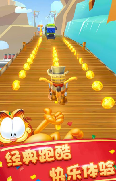 游戏借助经典卡通形象,打造出充满童趣的跑酷体验,游戏画面色彩鲜艳,加菲猫的形象可爱呆萌,动作表情生动有趣,赛道设计融入了很多卡通元素,有充满美食的街道,也有奇幻的梦境场景,玩家操控加菲猫奔跑,不仅要躲避障碍,还能收集喜欢的食物道具,触发各种有趣的特效。