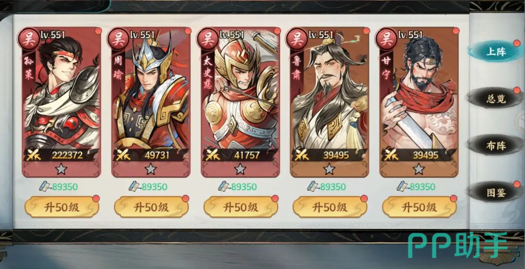 吴国主打弓兵体系与火系持续伤害,核心武将包括周瑜、陆逊、孙尚香和孙权。周瑜与陆逊是火攻流的核心,可造成大范围持续灼烧伤害;孙尚香擅长远程物理打击;孙权则能增强全队生存与输出能力。吴国在后期拥有全游戏中最强的AOE表现,尤其适用于国战与攻城战,在推图和团战中表现出色。但该阵营前期成长较慢,资源需求高,且高度依赖核心输出武将,在阵容未成型前易被魏国快攻压制。
