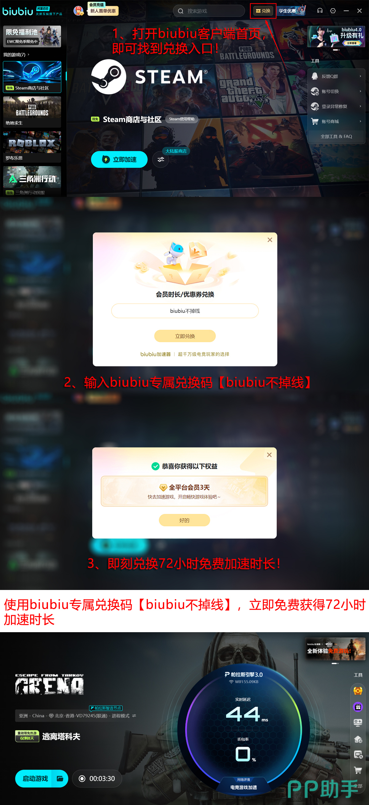 此外,biubiu为新用户准备了多重试用福利。注册即可领取新人专属礼包,包含24小时免费加速时长。若感觉不够用,还可参与限时兑换活动,输入口令【biubiu不掉线】即可额外获取72小时服务时间,总计可达96小时,充分满足初期体验需求。