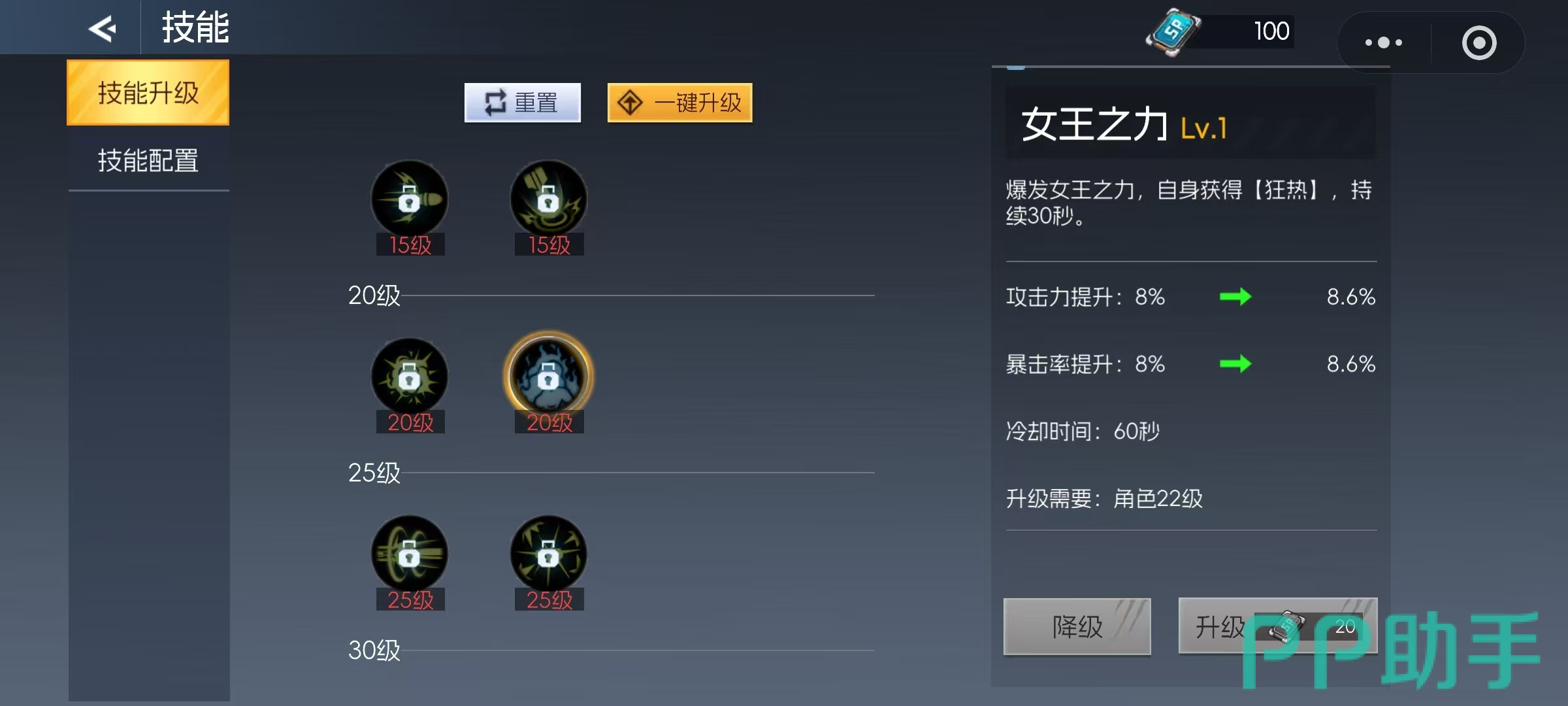 当角色进入20至40级区间时,20级技能“女王之力”成为必点项目,使用后可进入持续30秒的狂热状态,大幅提升攻击力与防御能力,为爆发输出提供强力支撑。与此同时,在35级解锁的“激光爆轰”也极具战略价值,这项全屏锁定、无需引导的自动释放技能,既能稳定打满伤害,又能避免操作中断,保障输出环境安全。将这两个技能与前期已成型的“引力弹”组合运用,即可实现控场与输出双线并进,全面适应中期副本节奏。