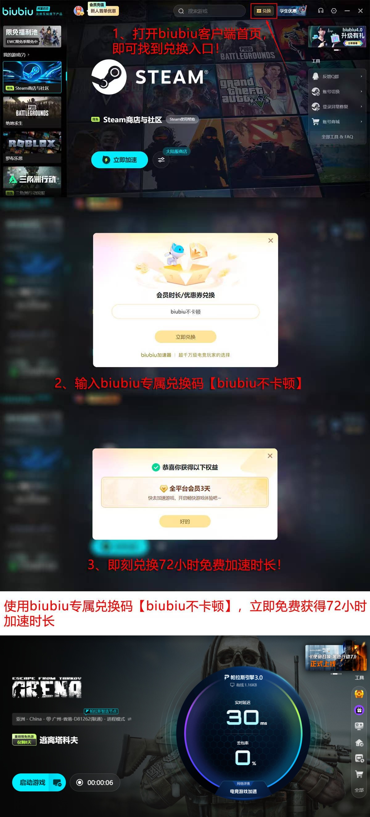 值得一提的是,biubiu也为新用户提供了一系列实用福利政策。首次登录即可免费领取24小时试用权限,便于用户全面测试加速效果。此外,输入指定口令【biubiu不卡顿】还可额外兑换72小时加速时长。两项优惠叠加后,新注册用户最高可享连续96小时的畅快加速体验,无需立即充值即可深入体验完整游戏流程。