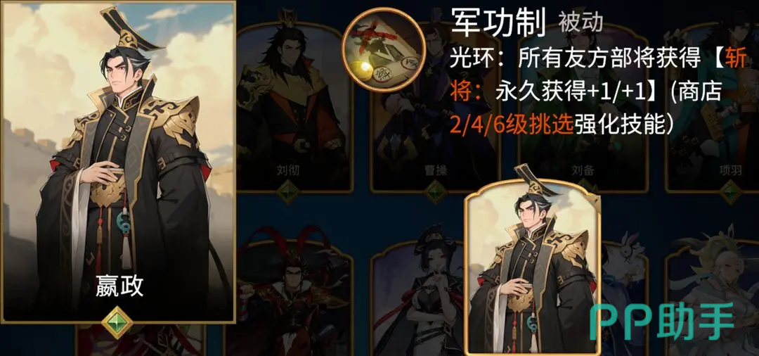定位为战力强化型统帅,能够赋予所有部将“斩将”能力,尤其与芈月联动时可多次触发该效果,非常适合构建“秦”阵营阵容。二本与四本阶段推荐选择“坚甲”技能,最大化部将血量优势,实现以一换二的压制效果,增强锁血能力。六本阶段则根据对局形势灵活调整:局势顺利时继续选择“坚甲”巩固生存;面对强势对手则切换为“利兵”,提升输出效率。若采用“汉”阵营,三次技能均可选“利兵”,配合“屏障”类部将,攻击力收益更为显著。整体优势在于前期战斗力迅速建立,后期部将成长稳定,但缺乏经济类技能,需依赖更多部将获取资源,不适合追求速升本的玩家。