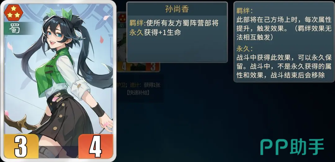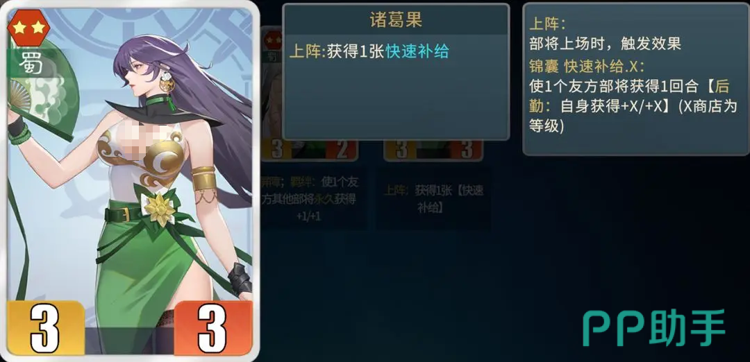 1、蜀:该卡属于蜀国阵营的基础功能型卡牌,具备“囤将”机制,无需部署至战场即可生效。招募后可立即获得一张补给卡,提供属性加成,其数值受商店等级影响。前期作用有限,不建议优先投入资源,但在后期阵容趋于完整时,可用于主输出角色的属性强化,若与“白虎”组合使用,效果更佳。需注意手牌容量,防止因溢出导致资源浪费。