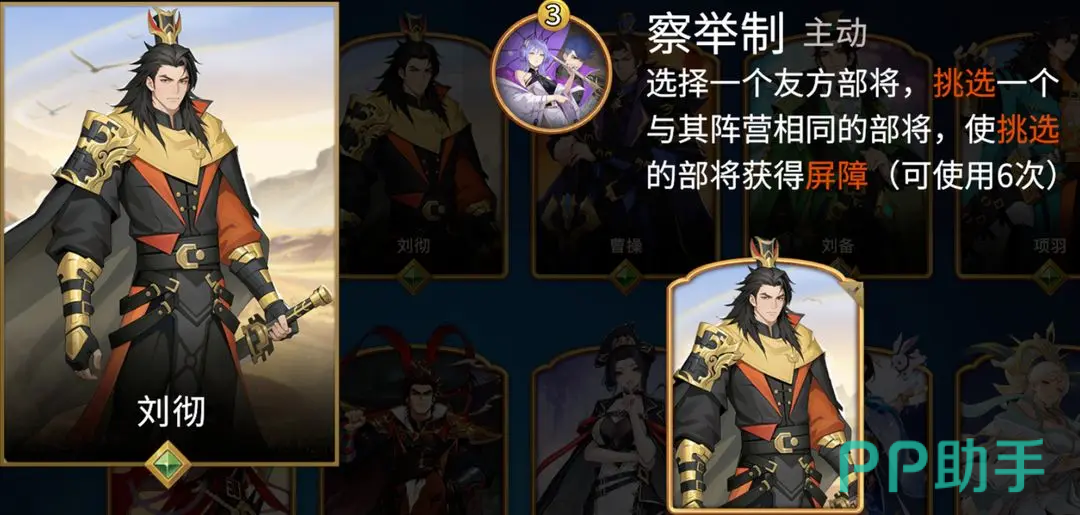其主动技能为“察举制”,可选定一名己方主力部将,并为其同阵营的其他部将施加“屏障”状态,可持续触发六次。同属战力导向型统帅,该技能有助于加速阵容成型,且“屏障”相当于额外生命,大幅提升容错率。技能效果受限于商店等级,建议在商店刷新质量不佳或生存压力较大时使用,初期可用1-2次寻找核心部将并附加屏障保障存活。最佳使用时机为阵容半成型阶段,确保为主力输出单位挂上保护。优势在于主C获得屏障后持续作战能力强,但技能次数有限,屏障分配不易精准控制,且经济产出较弱。