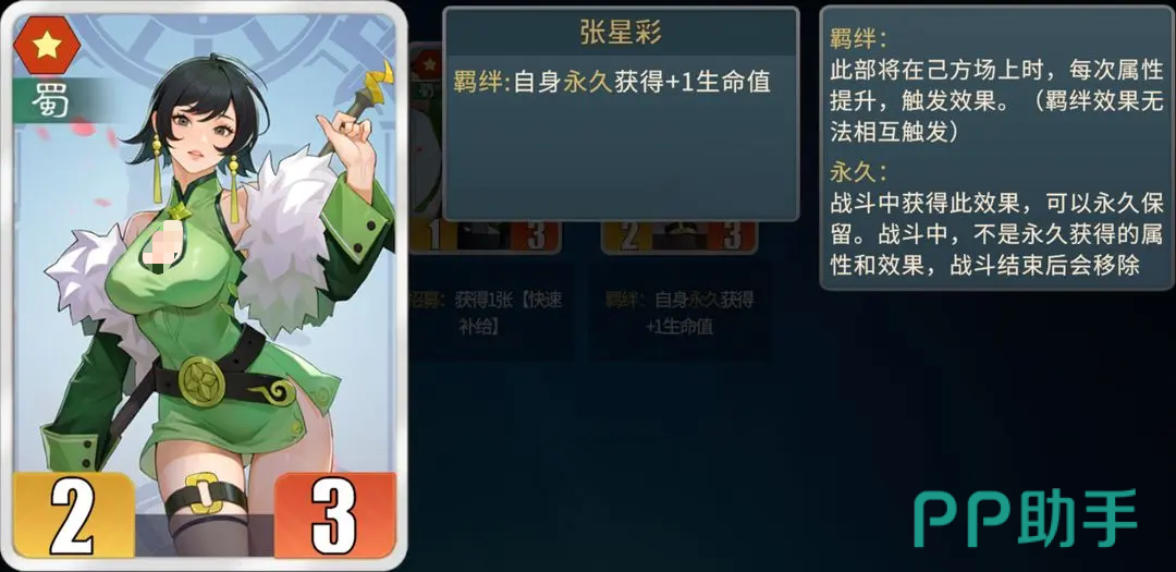 2、张星彩:此卡适用于游戏初期过渡阶段,其“羁绊”效果仅提升生命值。若单独上阵,战斗表现较为平庸,需配合具备属性增益的部将或统帅才能发挥应有实力,适合在体系未成型前作为临时战力补充。
