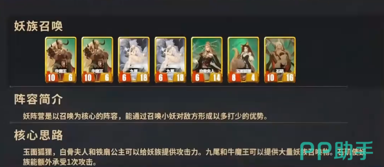 在妖族召唤流当中,铁扇公主能够为召唤物提供高额的攻击加成。在整个召唤流当中,铁扇公主作为攻击主力,时机娘娘,他其实能够有效地补充战场的兵力,这样就能够形成打不死的压制。牛魔王是特别重要的,因为它的出现能够持续性的压制,可以有效的提升整体的召唤率。另外在召唤流派当中,还会涉及到白骨夫人,他能够有效的保证血量,让战力处于稳定的状态。黑熊精,它能够保护后排的输出。