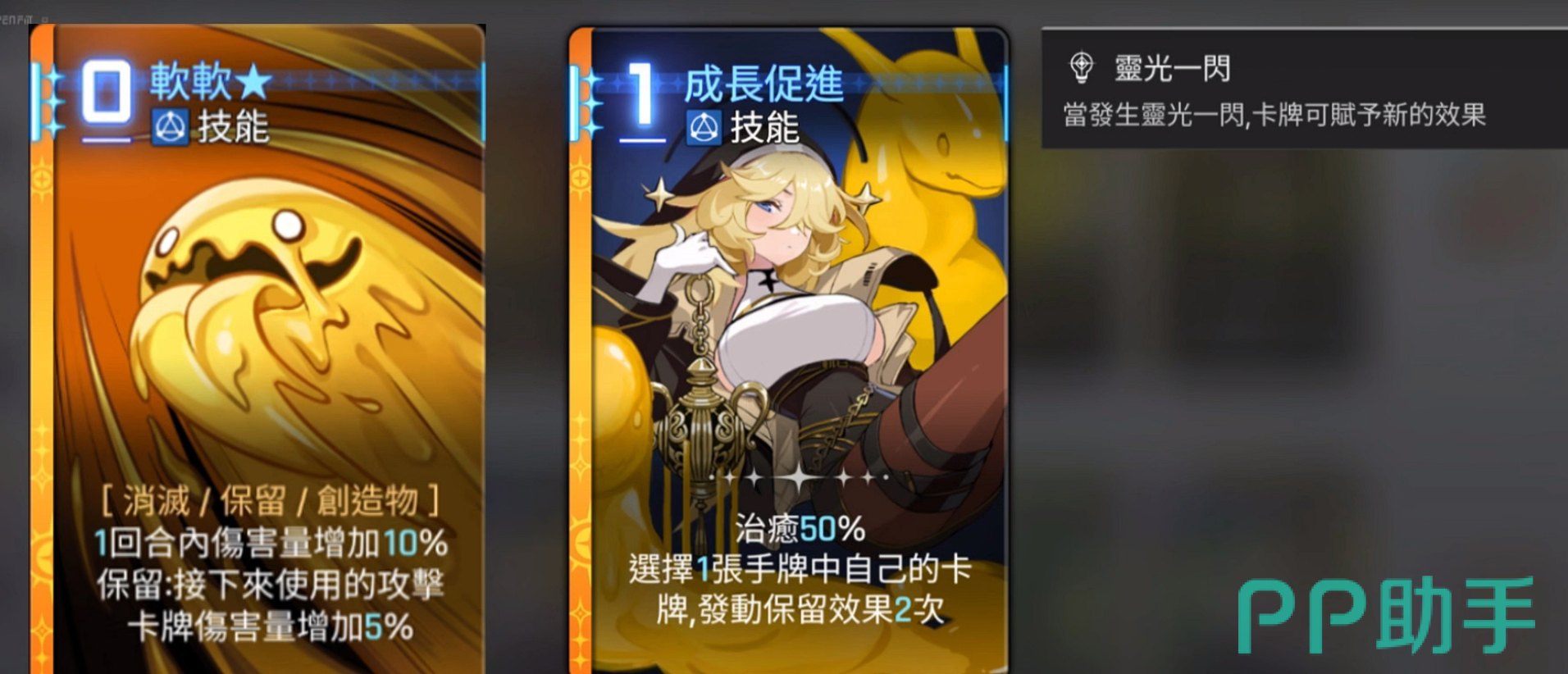技能成长促进,1费技能卡,拥有50%的生命值治疗效果,且会触发两次预留效果,升级之后可以复制创造物。