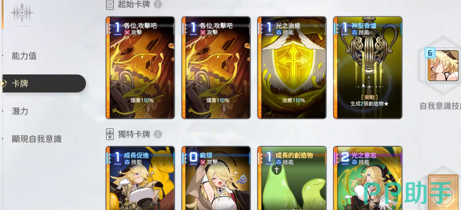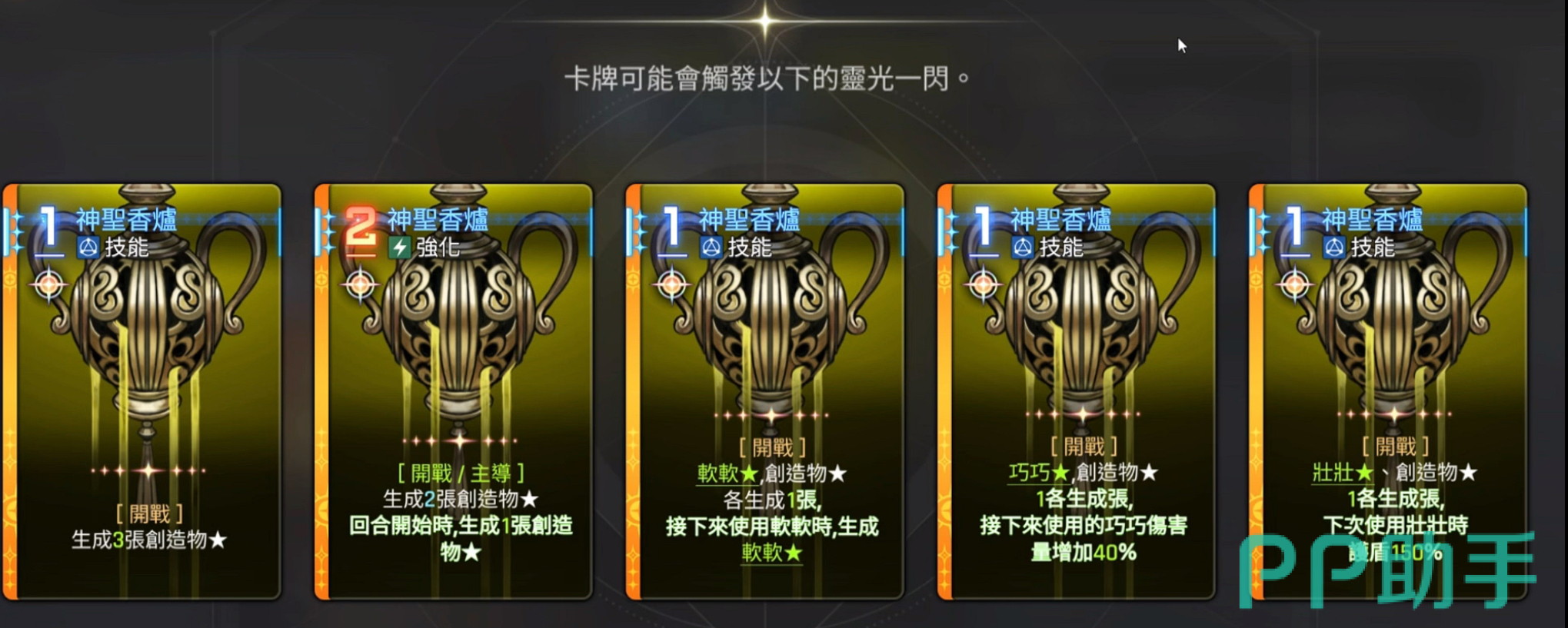 奥尔利亚的创造物机制,她的技能核心奥义就是以生成和进化创造物卡牌为主,初始卡牌“神圣香炉”会在回合开始的时候生成两张创造物,而这些创造物可以通过融合的方式来完成进化升级,最高等级是三星,可以为团队提供护盾和治疗以及提升伤害等增益buff。