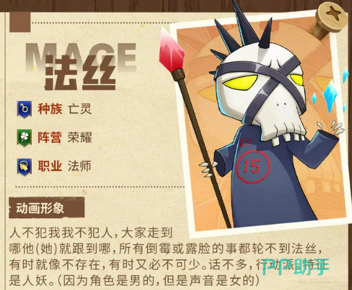 法丝是亡灵种族的,属于荣耀阵营,她的职业是法师。她的外形看起来是个男的,但声音却像女的,怎么看都有点奇怪,你可能会觉得有些人妖的感觉,但这正是她最大的特点之一。总是给人一种神秘的感觉,有时候你根本不会注意到她的存在,但当战斗时,你却会发现她的强大。