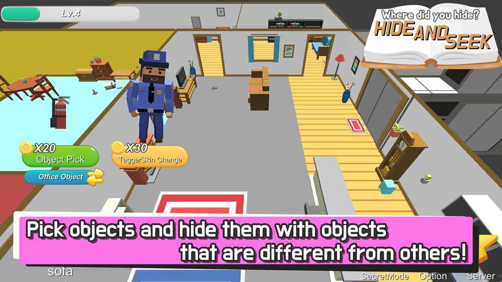 不同的阵营是开启躲藏还是寻找模式,超多的障碍物,合理的运用成功躲藏,实施抓捕多种不同的身份扮演不同的身份任意的切换。《躲猫猫大作战中》你可以选择成为一个对象,若是成为警察就要去寻找隐藏的对象,若是躲藏就要藏好。实时的多人大作战,体验到童年时候玩的躲猫猫,让玩家追寻丧失了的童心。只要以一个目标生存5分钟就能获得胜利,若是寻找到所有的隐藏对象,你也能获得胜利。