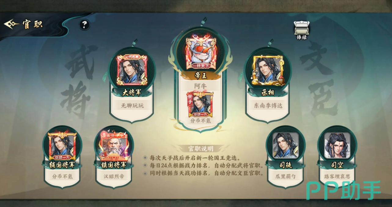 据观察,武将类官职的授予依据为每日战斗力排行榜结算结果,排名靠前的玩家可获封大将军、辅国将军等高位,彰显其实力地位;而文臣体系则依托当日累计战功进行分配,诸如丞相、司空、司徒等职位均属于此范畴,更注重战略布局与长期运营能力。系统会在每日24点统一评定并更新官职归属,竞争异常激烈,因此保持持续活跃是晋升的关键。