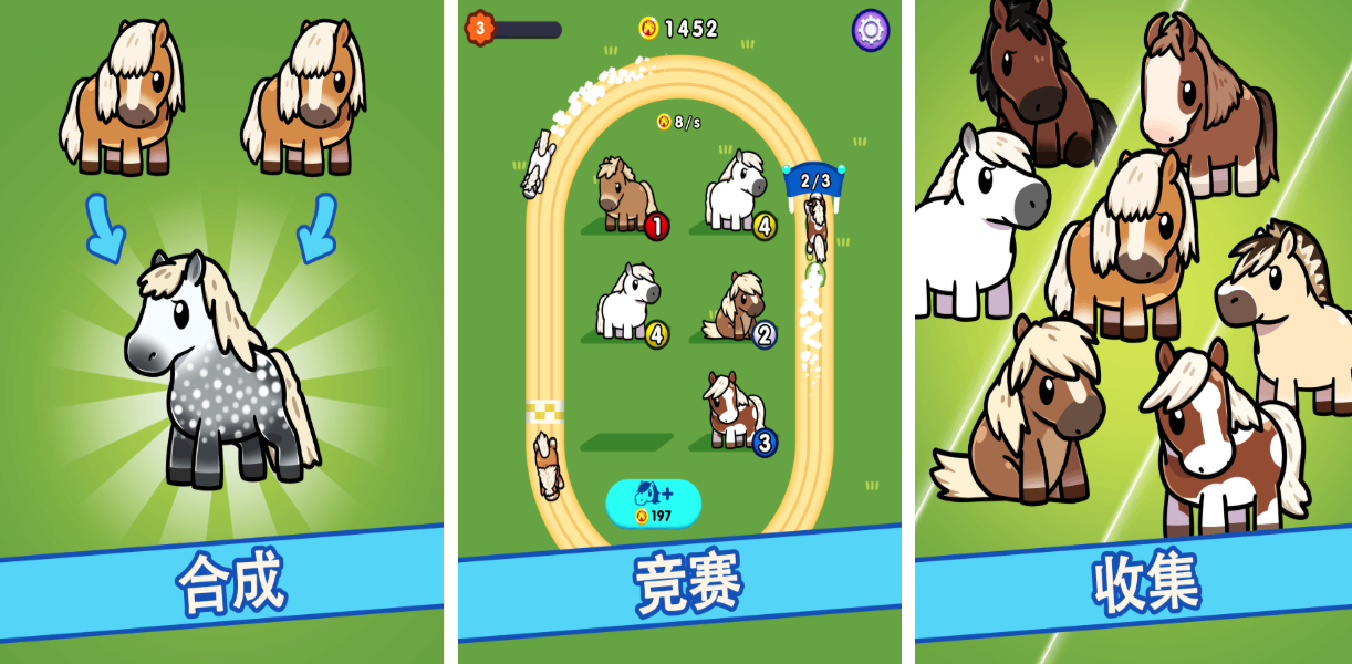 这是一款以合成为核心机制的放置类赛马游戏,玩家可通过融合两只低阶矮脚马获得更高等级的赛马。高品质赛马需由优质个体合成而来,策略性十足。除了养成系统外,游戏还设有多种竞赛模式与收集目标,结合萌系UI设计,整体风格轻松可爱。在趣味十足的赛马场中,与迷你马匹展开亲密互动,享受轻松时光。