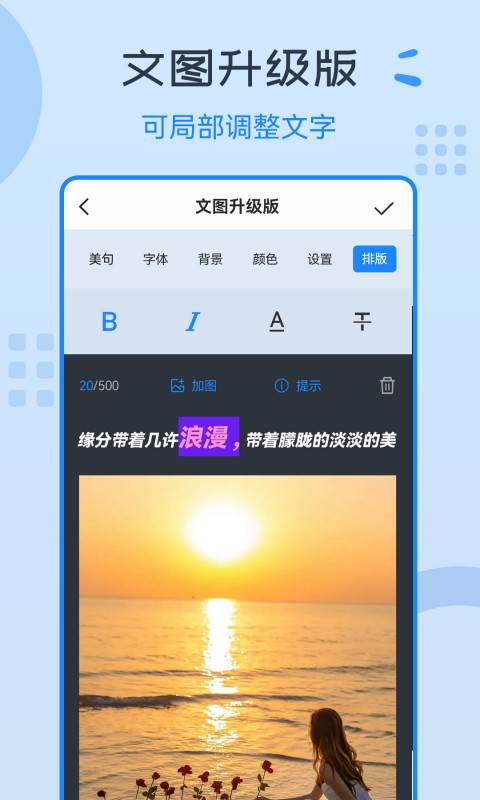 这是一款专为图片设计而打造的软件,操作界面特别的简洁直观,便于用户快速的进行上手。在文字编辑方面提供实时阅览功能,用户可以随时的去查看修改后的效果,避免因误操作而导致成品不符合预期。