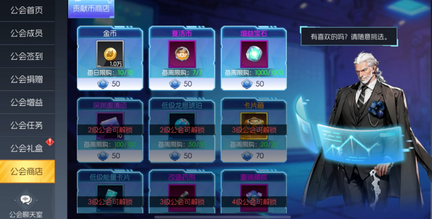 最后说说公会秘宝和公会商店。公会秘宝是公会的重要资源,公会成员通过积累钥匙点数可以开启公会秘宝,得到增益宝石、贡献币等奖励。而公会商店里可以用贡献币购买一些好东西,不过要注意,公会等级越高,能购买的商品也越多。