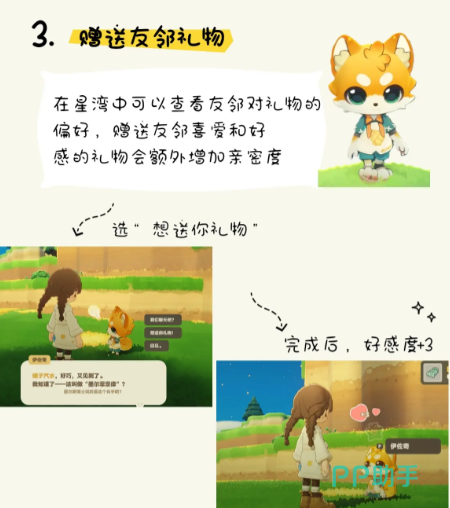 赠送礼物就是迅速拉近彼此之间距离的关键,在选对礼物之后可以获取三点基础的亲密度。还能有机会拿到来自于朋友的回礼,这才是比较暖心的双向奔赴。在送礼之前大家就可以看一下他们的偏好,每一个npc都有自己所喜欢的物品,例如有一些会喜欢比较甜的零食,有一些喜欢实用的小道具。如果正确的选择所喜爱的礼物,就可以直接触发额外的亲密度加成,相反,要是送了一些反感的礼物,不仅没有办法拿到好感,还可能会直接被退回。所以在此时就可能会造成浪费,建议大家在送礼的时候一定要选择投其所好,不要选择过于的盲目。