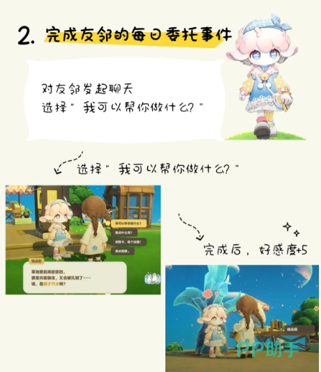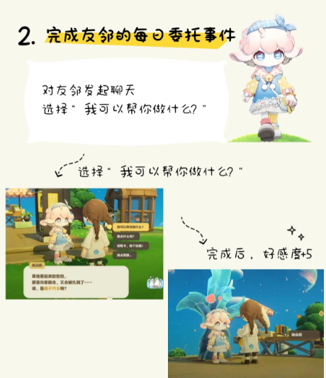 帮助对方去完成每日委托,这就是快速提升亲密度的一个方法。一次性就可以收获5点好感度,性价比还是比较高的,例如在聊天时可以询问对方,我有什么可以帮你的吗?接下来就可以接下他们的委托任务。委托内容就可以有效贴合于日常,例如可以去解决光脚走路被扎的小麻烦,又或者是满足其他朋友的小需求,亲密度并不是很高,但是却很有代入感,一旦在完成委托之后就可以拿到高额的亲密度。