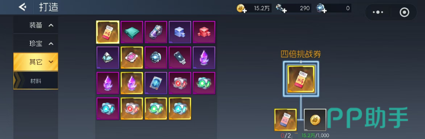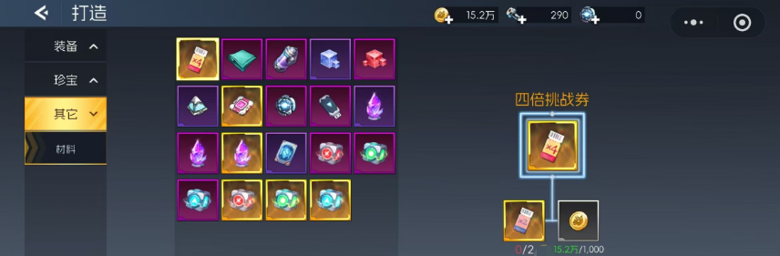 最后,我们来说说“其他”类的打造材料。这类材料包括四倍挑战券、高级强化纤维、强化保护剂和高级变换物质等。这些材料的作用是帮助你进一步提升装备的等级和属性。比如,四倍挑战券是由双倍挑战券和金币合成而成的,高级强化纤维则需要用强化纤维和金币合成。这些高级材料非常重要,打造高级装备时离不开它们。