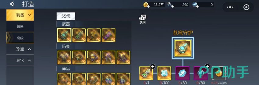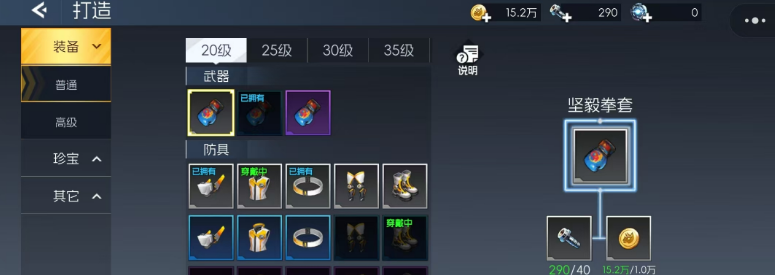 首先,打造系统的解锁是从玩家等级20级开始的,到时候,你就能在界面右下角找到变强的按钮。点开之后,你会看到很多选项,其中打造和改造是不同的,不要弄错了。打造分为三个主要部分,装备、珍宝和其他。我们先说装备打造。装备打造可以让你强化武器、防具和饰品这些东西。普通的打造,基本上需要的是一些常见的材料,玩家在日常活动中就能得到这些东西。但如果你想进行更高等级的打造,就需要一些特殊的材料,比如天空之源、始源龙骸,或者在遗迹宝库掉落的精粹钢。这些材料是打造高级装备的关键。