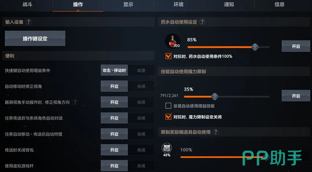 技能循环的完善并不仅仅是将技能拖入栏位中,还需要配合便利设置来达到“自动化行为的优化”。增益药剂(加速药水、魔力恢复剂等)如果设置为“自动使用”,那么即使在主城也会不断地消耗资源,非常不划算;如果设置为“攻击或者移动的时候”,则可以在战斗中触发,避免浪费。视角修正功能主要是为手动战斗或者半挂机状态服务的,可以保证角色的方向稳定,有利于提高命中率和走位效率。在进行主线任务的时候,自动传送后对话和狩猎功能可以开启,系统会自动完成一部分流程,把玩家的思考和操作集中在技能循环以及挂机地点的选择上。