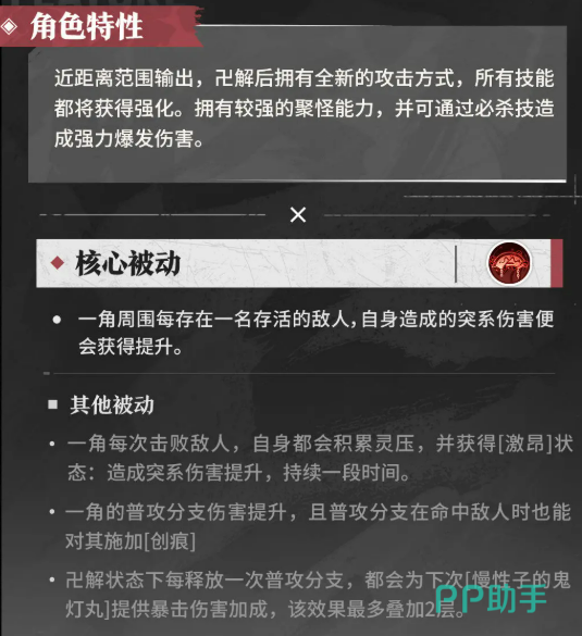 一角的核心被动能力也蛮强的,简单来说,他每多一个敌人存活在场,他造成的伤害就越高,这样的设计对于群战来说非常好。毕竟,打怪的时候,敌人越多,伤害提升也越大,配合上一些技能,简直能打得敌人没脾气。而且他每次击败敌人后,还能积累灵压,触发“激昂”状态,这个状态可以让他继续提升伤害,给你更大的输出空间,打击感也特别明显。
