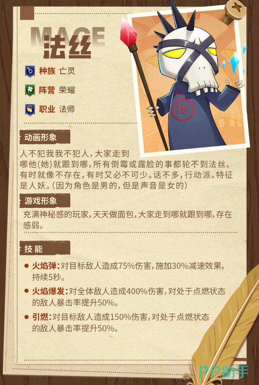 另外,玩家也需要注意,在亡灵当中有一个叫法丝的成员,他其实有着比较有意思的形象,一直都秉持着人不犯我,我不犯人。而他却是大家走到哪里,他就会跟到哪里。正是因为他特别的神秘,还喜欢天天做面包,不过他所拥有的技能却特别的丰富,比如火焰弹,火焰爆发以及引燃等等。