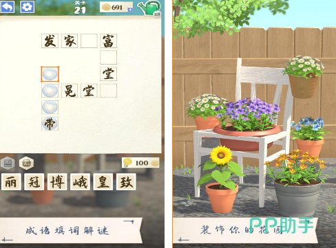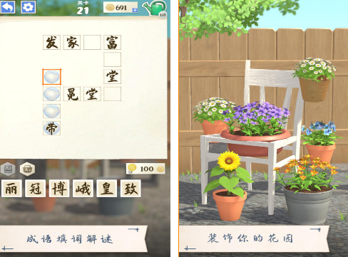 将传统文化与休闲养成巧妙结合,玩家需帮助奶奶打理一座花园,通过完成成语接龙挑战获取水滴浇灌花朵。每通关一关即可解锁新的植物与装饰,逐步打造出独一无二的美丽庭院。寓教于乐的设计,既锻炼思维能力,又带来视觉上的愉悦享受。