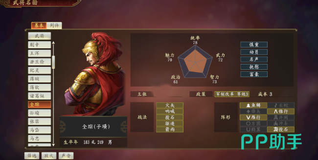 从基础属性来看,全琮属于典型的全能型中坚将领。其武力为72,统帅高达78,智力也达到75,这一配置使他既能参与前线作战,也能胜任指挥调度任务。速度值为45,初始稍显缓慢,但得益于较高的成长率,在后期培养成型后仍能有效提升行动节奏。政治与魅力属性虽无突出表现,但在执行内政或辅助类玩法时仍可提供一定支持。更重要的是,全琮的成长曲线平稳,各阶段战斗力持续在线,不会出现前期强势而后期乏力的情况。