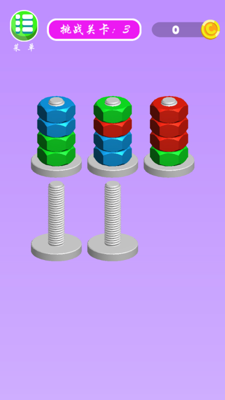 一个以颜色配对为主的休闲益智手游,玩家需要把杂乱叠放的彩色螺母按颜色分到对应螺栓,规则有些类似于汉诺塔,每次只能移动最上方的螺栓,随着关卡进展,螺母的颜色会越来越多,还会加入一些特殊螺母和时间限制。游戏采用3D画面,而且加入了ASMR音效和震动反馈,作为休闲解压游戏也很不错。