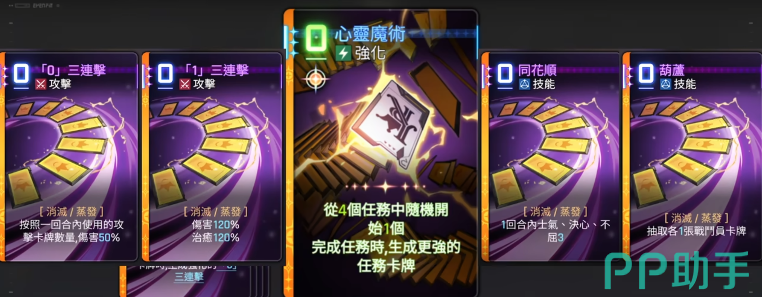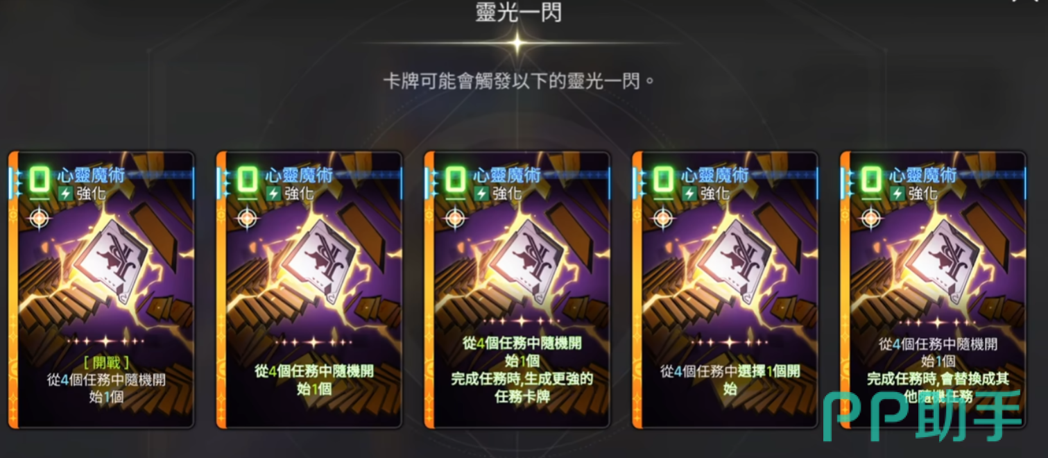凯西乌斯的基础技能组包含四张常规卡牌:一费攻击、二费攻击、一费治疗,以及一张关键的一费强化卡——心灵魔术。这张卡的核心在于触发四种随机任务之一,每完成一个任务即可获得对应的任务卡奖励。具体任务包括:【任务0:三连击】,当使用三张费用为0的卡牌时激活,造成基于本回合攻击次数40%的伤害;【任务1:三连击】,累计使用三张费用为1的卡牌后生成,提供90%攻击力的伤害或治疗效果;【任务:同花顺】,在分别使用0费、1费、2费卡各一张后解锁,赋予士气、决心、不屈各2层增益;最后是【0任务:葫芦】,在使用不同战斗员卡牌后触发,直接抽两张牌。玩家可通过界面左上角实时查看任务进度,便于规划出牌顺序。其中,“同花顺”和“葫芦”因具备团队增益与高效过牌能力,成为主流构筑中最常利用的两个任务路径。