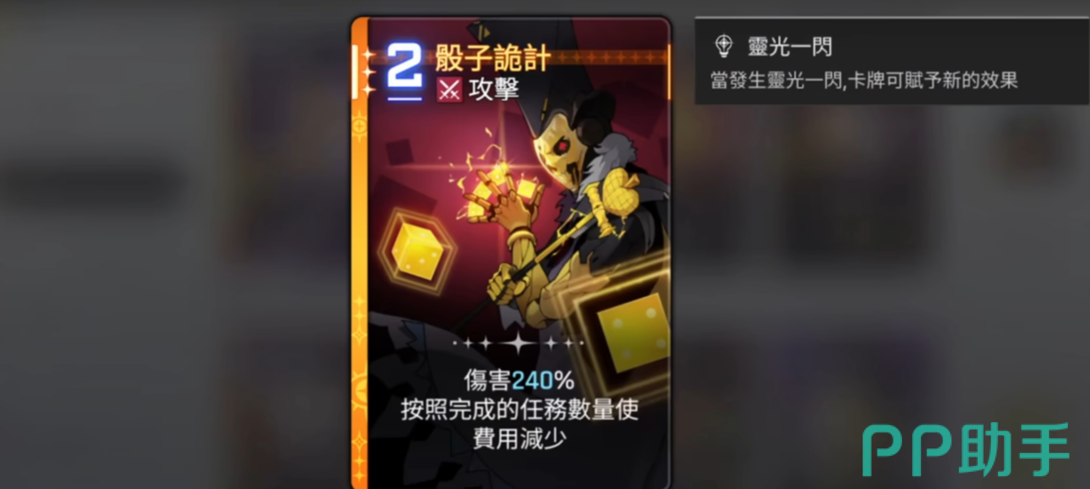 灵光一闪系列进一步优化了任务启动与完成效率。前两张灵光一闪不仅保留从四项任务中随机开启一项的能力,还新增【开战】标签,允许首回合立即推进任务进度。第三张升级版在任务完成后会生成更强力的任务卡,例如“葫芦”任务由原本抽2张升级为抽取各一张战斗员卡牌。第四张则将随机选择改为手动指定任务,大幅降低不确定性。第五张则在任务完成后替换为其他随机任务,在遭遇低价值任务时具有一定调整空间。此外,恶魔骰子作为一费攻击卡,基础效果为160%单体伤害并抽1,其灵光一闪强化路线多样:第一张提升伤害至200%,并额外生成一张任务卡;第三张转为群体攻击,对所有敌人造成160%伤害,并根据目标数量抽牌;第四张伤害增至240%,抽2但需弃2;第五张则依据此卡费用(1费)对全体敌人造成60%×1=60%伤害并抽1。这些设计共同构成了凯西乌斯强大的资源循环体系。