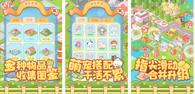 本作是一款融合收集与合成机制的城市经营游戏,背景设定在充满活力的动物世界中。游戏中包含丰富的图鉴系统,玩家可招募多种萌宠NPC参与城市建设。通过滑动屏幕完成建筑合成与升级操作,玩法简单却不失策略性。明亮的场景配色与精细的UI布局共同构建出一个栩栩如生的动物城环境,带来强烈的视觉代入感。