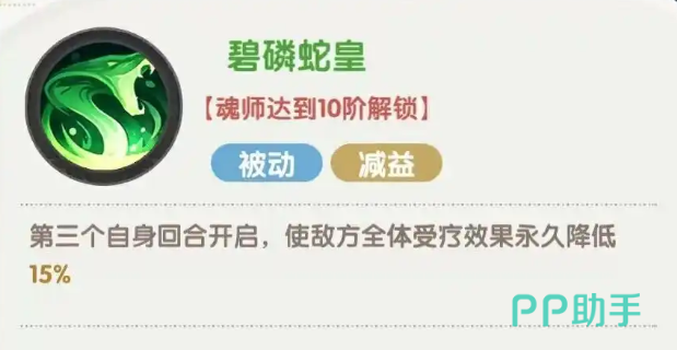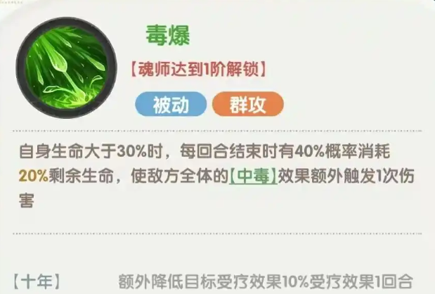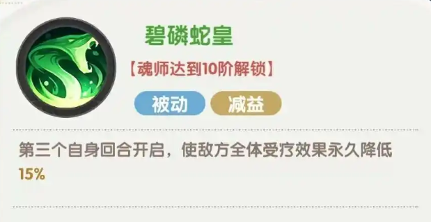 独孤博的核心技能之一是碧磷蛇皇,此技能需在场上存活满3回合后方可激活。一旦触发,可使敌方全体单位受到减益,降低其15%的回奶效率,且该效果将持续至战斗结束或敌人被击败为止,属于长效功能性技能。配合高年份魂环加成,该技能在中毒机制上的增益尤为突出:当魂环年份达到10年时,独孤博在受到伤害后有10%概率使敌方附加一层中毒状态。