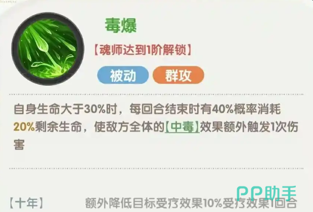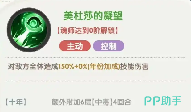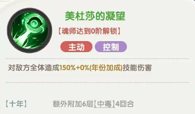 随着魂环年份的提升,美杜莎的凝望还能进一步强化,实现石化与中毒状态的双重附加。其中,中毒最多可叠加至10层,而石化附加概率最高可达60%。其第一个被动技能毒暴,在自身生命值高于30%时激活,可通过消耗部分生命值使目标进入中毒状态。这一机制不仅增强了持续伤害能力,还能有效压制敌方治疗类魂师的恢复效率。