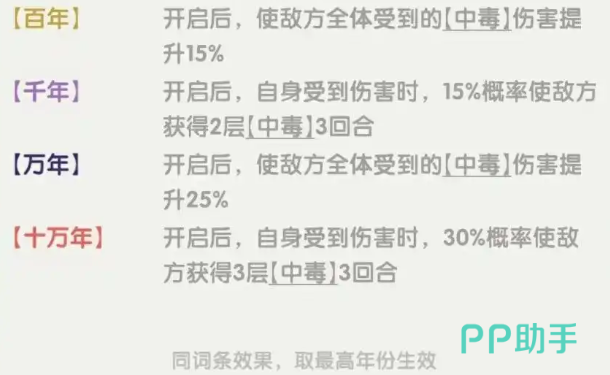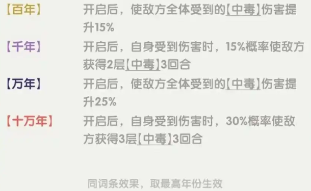 若魂环提升至百年级别,则中毒伤害整体提升15%,而在生命值达到10万点的情况下,每当独孤博承受伤害并成功突破防御时,更有30%几率为敌方施加3层中毒效果。因此,若选择走持续伤害流派,独孤博的表现极为出色。每个技能在不同魂环年份加持下均会提升状态附加概率,年份越高,中毒与石化的触发几率及持续伤害上限也随之提高。