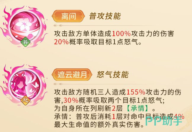 作为游戏中少数具备干扰与压制能力的辅助型武将,貂蝉在控制敌方节奏方面有着不可替代的作用。她的普攻可对目标造成100%攻击力的伤害,并有20%概率吸取对方1点怒气值,有效延缓敌方大招释放时机。主动技能可随机攻击三个敌方单位,造成155%攻击力的伤害,同时30%概率窃取怒气,并叠加2层“承情”状态。每次普攻会消耗一层“承情”,并对目标附加相当于其最大生命值4%的真实伤害,对高血量单位威胁极大。