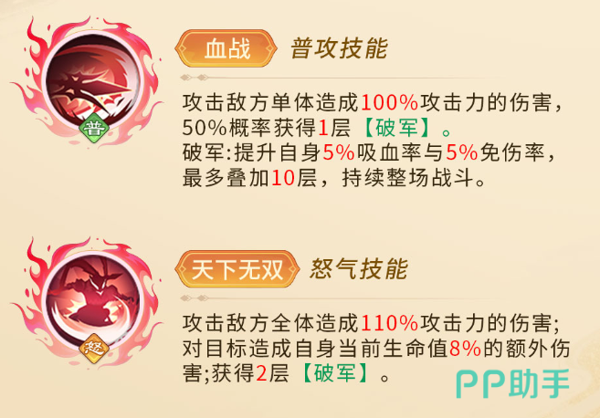 素有“三国第一猛将”之称的吕布,在本作中也展现出压倒性的战斗力。其基础面板数值在所有武将中位居前列,尤其在攻击端达到当前版本的顶级水准。普攻“血战”可对单一敌人造成100%攻击力的伤害,并有50%几率触发“破军”状态,每层提供5%吸血与免伤效果,最多叠加10层且持续整场战斗。这一机制使得吕布在持久战中越打越强,生存与输出能力同步提升。
