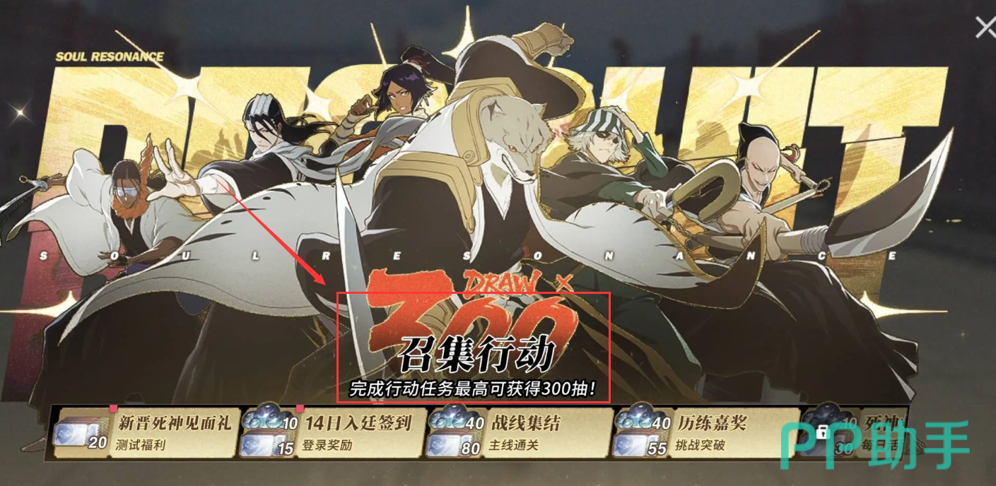 此外,在游戏开服初期会开启“征召行动”活动任务,参与即可领取新晋死神见面礼和连续14天的签到奖励。完成战线集结与历练嘉奖目标后,还能额外获得抽卡机会,助力玩家更快组建强力阵容。