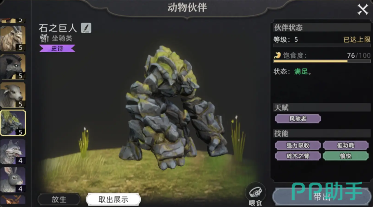 石之巨人为传说级存在,由岩石构成身躯,皮肤极其坚固,常出没于密林深处。玩家需要战胜它后方可收服。此宠物拥有高达30%的伤害减免效果,同时还能减轻药剂使用后产生的负面状态,非常适合用于高难度副本或长期野外生存场景。